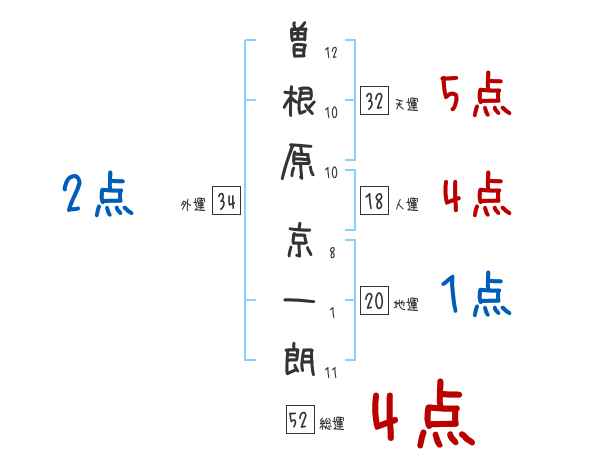 天運![]() | 曽根原京一朗さんの天運は32画の5つ星!柔軟性があり成功する。チャンスが多く金運が良い。 家系が持つ宿命的な運勢を表します。祖先から受け継いだ苗字ですので自分の力が及びません。家柄を象徴します。 |