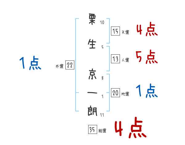 天運![]() | 栗生京一朗さんの天運は15画の4つ星!人徳があり出世する。順調に物事を進め円満な人生。 家系が持つ宿命的な運勢を表します。祖先から受け継いだ苗字ですので自分の力が及びません。家柄を象徴します。 |