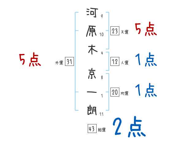 総運![]() | 河原木京一朗さんの総運は43画の2つ星!頑固な性格で独立心が強いかも。やや非現実的で浪費に注意しましょう。 あなたの人生を表す1番重要な運勢です。生涯を通じて影響する総合運となり、主に50歳以降の晩年期に影響を及ぼします。 |