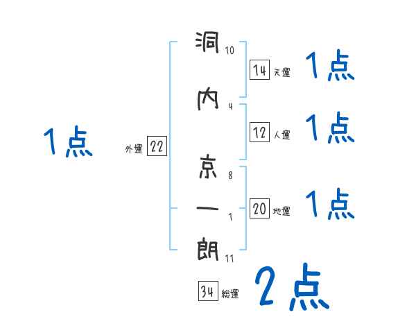 天運![]() | 洞内京一朗さんの天運は14画の1つ星!人に対して優しいがストレスを溜め込みがち。人間関係のトラブルを避けるよう気をつけましょう。 家系が持つ宿命的な運勢を表します。祖先から受け継いだ苗字ですので自分の力が及びません。家柄を象徴します。 |