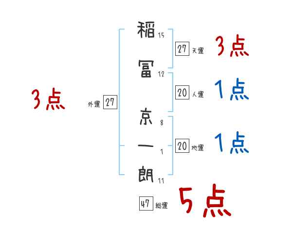 総運![]() | 稲冨京一朗さんの総運は47画の5つ星!実力が開花し発展する円満な人生。財に恵まれる。 あなたの人生を表す1番重要な運勢です。生涯を通じて影響する総合運となり、主に50歳以降の晩年期に影響を及ぼします。 |