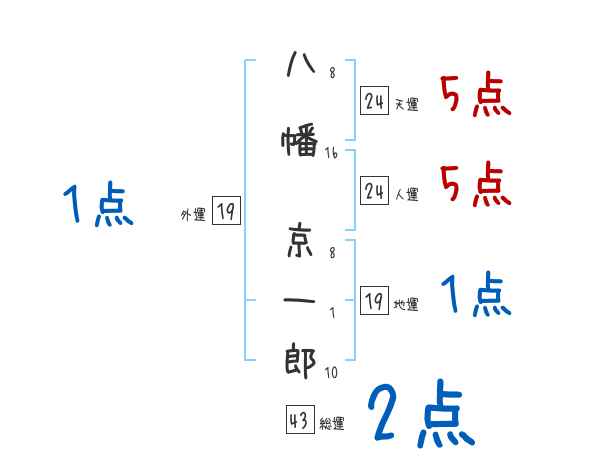 天運![]() | 八幡京一郎さんの天運は24画の5つ星!家庭運が良く順調な人生。金運にも恵まれる。 家系が持つ宿命的な運勢を表します。祖先から受け継いだ苗字ですので自分の力が及びません。家柄を象徴します。 |