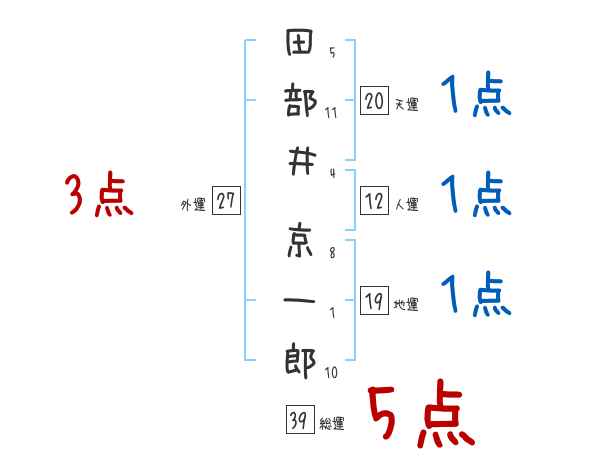 総運![]() | 田部井京一郎さんの総運は39画の5つ星!社交性に優れ人望が厚い。人の上に立ち成功する。 あなたの人生を表す1番重要な運勢です。生涯を通じて影響する総合運となり、主に50歳以降の晩年期に影響を及ぼします。 |