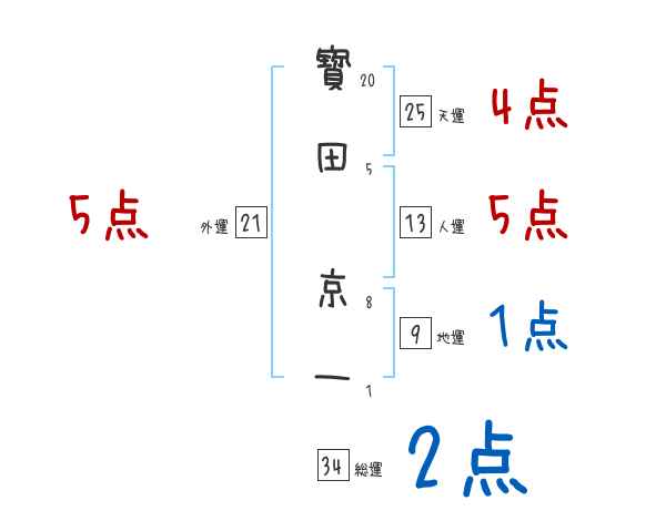 総運![]() | 寳田京一さんの総運は34画の2つ星!独創性に優れるが、自尊心が強く災難に注意しましょう。 あなたの人生を表す1番重要な運勢です。生涯を通じて影響する総合運となり、主に50歳以降の晩年期に影響を及ぼします。 |