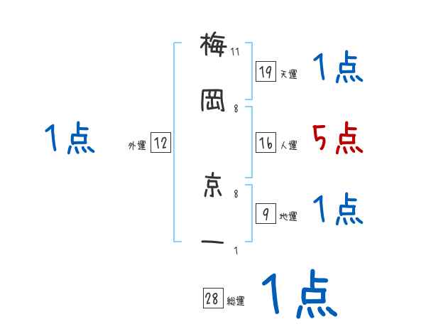 人運![]() | 梅岡京一さんの人運は16画の5つ星!人望が厚く大きく発展する。逆転成功が見える。 性格や才能などを表す2番目に重要な運勢です。人間関係や協調性、社会的な成功に影響します。主に20歳から50歳ぐらいまでの中年期の運勢を表します。 |