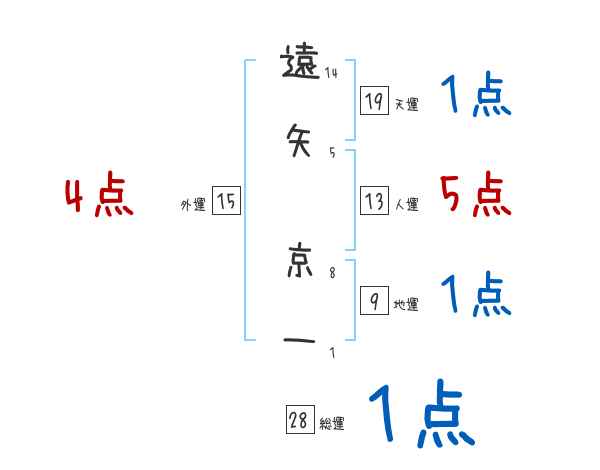 総運![]() | 遠矢京一さんの総運は28画の1つ星!家庭環境に注意。スポーツで活躍できる能力があるかも。 あなたの人生を表す1番重要な運勢です。生涯を通じて影響する総合運となり、主に50歳以降の晩年期に影響を及ぼします。 |