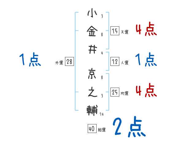 外運![]() | 小金井京之輔さんの外運は28画の1つ星!家庭環境に注意。スポーツで活躍できる能力があるかも。 生活面を象徴する運勢です。外部から受ける影響力を表し、結婚運、家庭運や職場、環境への順応性を表します。 |