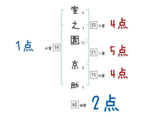 外運![]() | 室之園京助さんの外運は19画の1つ星!優れた才能を持ちますが、協調性が足りないことも。周りの人と協力する事を意識しましょう。 生活面を象徴する運勢です。外部から受ける影響力を表し、結婚運、家庭運や職場、環境への順応性を表します。 |