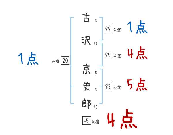 総運![]() | 古沢京史郎さんの総運は45画の4つ星!もくもくと物事を進め達成する。地味な努力家。 あなたの人生を表す1番重要な運勢です。生涯を通じて影響する総合運となり、主に50歳以降の晩年期に影響を及ぼします。 |