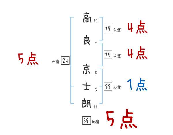 総運![]() | 高良京士朗さんの総運は39画の5つ星!社交性に優れ人望が厚い。人の上に立ち成功する。 あなたの人生を表す1番重要な運勢です。生涯を通じて影響する総合運となり、主に50歳以降の晩年期に影響を及ぼします。 |