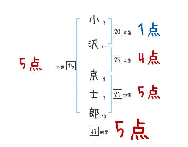 外運![]() | 小沢京士郎さんの外運は16画の5つ星!人望が厚く大きく発展する。逆転成功が見える。 生活面を象徴する運勢です。外部から受ける影響力を表し、結婚運、家庭運や職場、環境への順応性を表します。 |