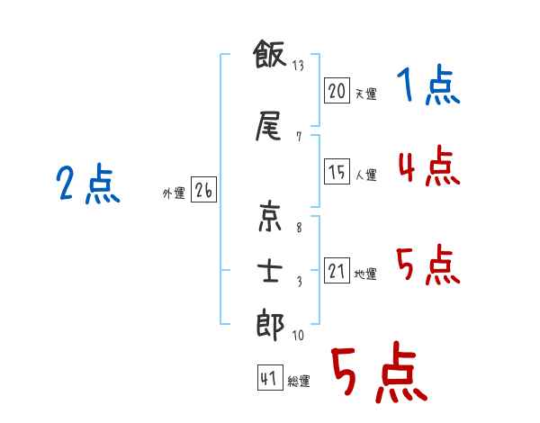 外運![]() | 飯尾京士郎さんの外運は26画の2つ星!波瀾万丈かも。信頼できる人を大事にしましょう。 生活面を象徴する運勢です。外部から受ける影響力を表し、結婚運、家庭運や職場、環境への順応性を表します。 |