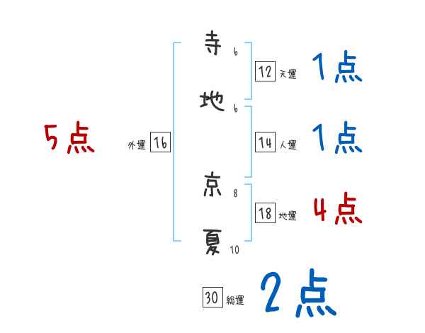 総運![]() | 寺地京夏さんの総運は30画の2つ星!浮き沈みの激しさに注意しましょう。 あなたの人生を表す1番重要な運勢です。生涯を通じて影響する総合運となり、主に50歳以降の晩年期に影響を及ぼします。 |