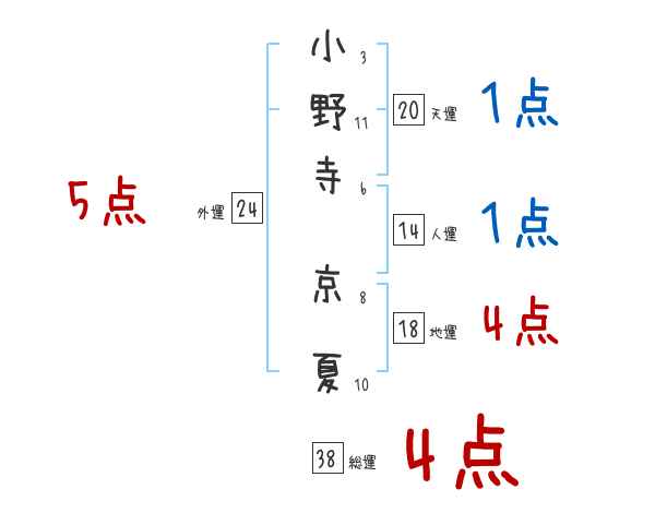 総運![]() | 小野寺京夏さんの総運は38画の4つ星!温厚な性格で技術的な才能を発揮する。職人的な仕事に向いている。 あなたの人生を表す1番重要な運勢です。生涯を通じて影響する総合運となり、主に50歳以降の晩年期に影響を及ぼします。 |