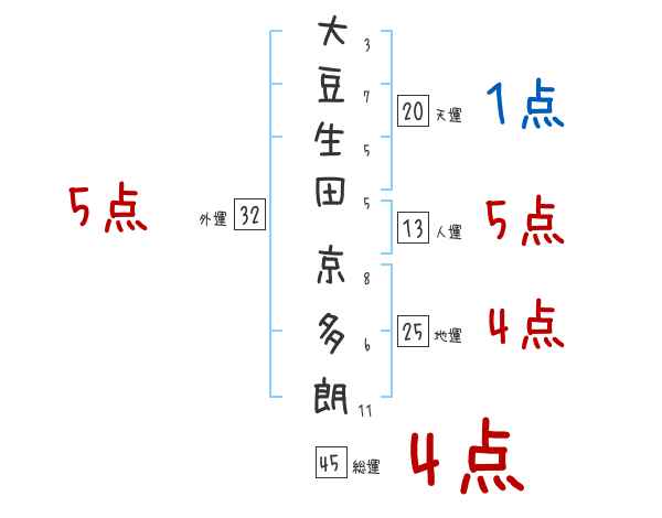 外運![]() | 大豆生田京多朗さんの外運は32画の5つ星!柔軟性があり成功する。チャンスが多く金運が良い。 生活面を象徴する運勢です。外部から受ける影響力を表し、結婚運、家庭運や職場、環境への順応性を表します。 |