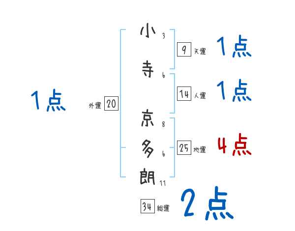 天運![]() | 小寺京多朗さんの天運は9画の1つ星!消極的で才能を発揮することが苦手なことも。周りの意見に耳を傾けましょう。 家系が持つ宿命的な運勢を表します。祖先から受け継いだ苗字ですので自分の力が及びません。家柄を象徴します。 |