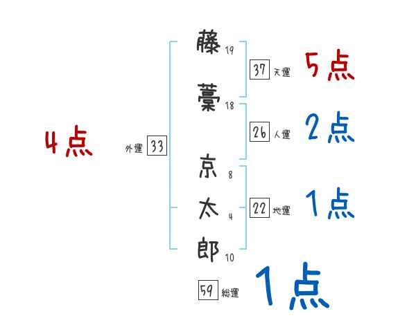 外運![]() | 藤藁京太郎さんの外運は33画の4つ星!権力志向でプライドが高い。勇気があり運を切り開き成功する。 生活面を象徴する運勢です。外部から受ける影響力を表し、結婚運、家庭運や職場、環境への順応性を表します。 |