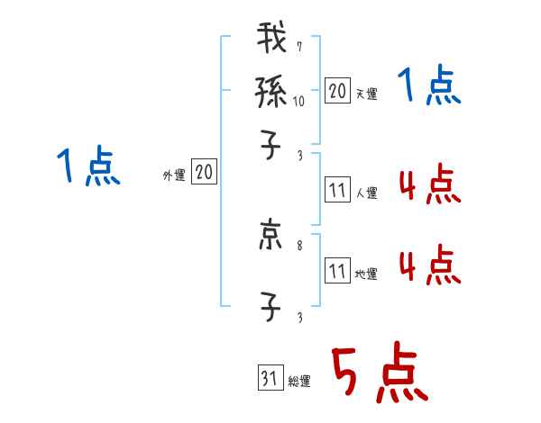 人運![]() | 我孫子京子さんの人運は11画の4つ星!着実に富や地位を得る幸運な人生。 性格や才能などを表す2番目に重要な運勢です。人間関係や協調性、社会的な成功に影響します。主に20歳から50歳ぐらいまでの中年期の運勢を表します。 |
