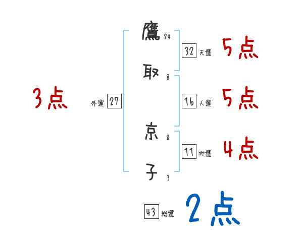天運![]() | 鷹取京子さんの天運は32画の5つ星!柔軟性があり成功する。チャンスが多く金運が良い。 家系が持つ宿命的な運勢を表します。祖先から受け継いだ苗字ですので自分の力が及びません。家柄を象徴します。 |