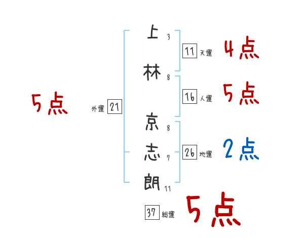人運![]() | 上林京志朗さんの人運は16画の5つ星!人望が厚く大きく発展する。逆転成功が見える。 性格や才能などを表す2番目に重要な運勢です。人間関係や協調性、社会的な成功に影響します。主に20歳から50歳ぐらいまでの中年期の運勢を表します。 |