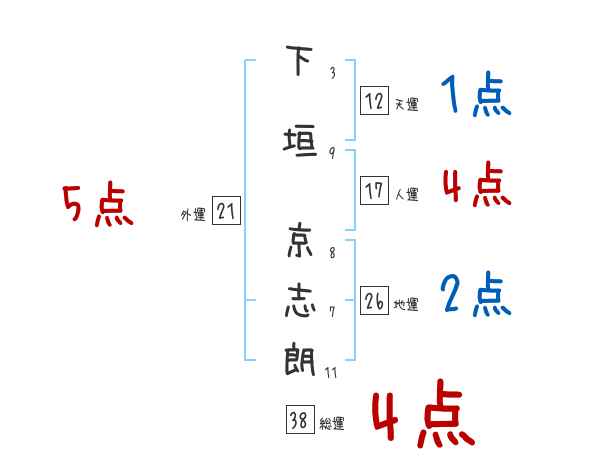 外運![]() | 下垣京志朗さんの外運は21画の5つ星!統率力がある。独立し成功する。名誉を手に入れる。 生活面を象徴する運勢です。外部から受ける影響力を表し、結婚運、家庭運や職場、環境への順応性を表します。 |