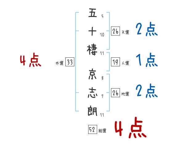 外運![]() | 五十棲京志朗さんの外運は33画の4つ星!権力志向でプライドが高い。勇気があり運を切り開き成功する。 生活面を象徴する運勢です。外部から受ける影響力を表し、結婚運、家庭運や職場、環境への順応性を表します。 |