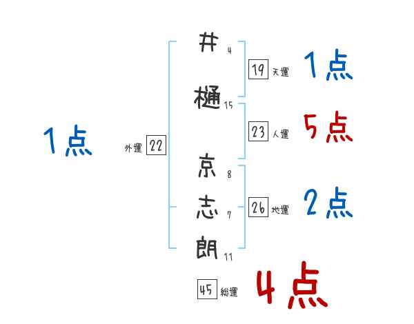 人運![]() | 井樋京志朗さんの人運は23画の5つ星!想像力に優れ活力がある。一代で成功し名誉を手に入れる。 性格や才能などを表す2番目に重要な運勢です。人間関係や協調性、社会的な成功に影響します。主に20歳から50歳ぐらいまでの中年期の運勢を表します。 |