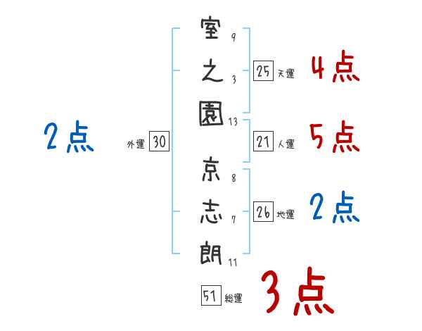 総運![]() | 室之園京志朗さんの総運は51画の3つ星!変化が激しく、危険に注意。堅実な性格。 あなたの人生を表す1番重要な運勢です。生涯を通じて影響する総合運となり、主に50歳以降の晩年期に影響を及ぼします。 |