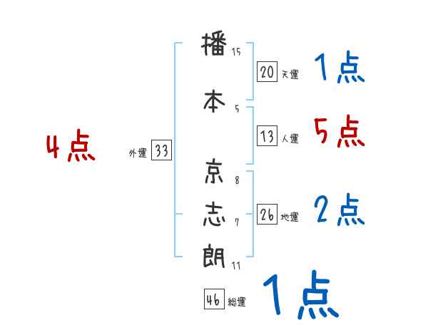 外運![]() | 播本京志朗さんの外運は33画の4つ星!権力志向でプライドが高い。勇気があり運を切り開き成功する。 生活面を象徴する運勢です。外部から受ける影響力を表し、結婚運、家庭運や職場、環境への順応性を表します。 |