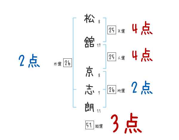 天運![]() | 松舘京志朗さんの天運は25画の4つ星!個性があり才能があふれる。強運の持ち主で発展する。 家系が持つ宿命的な運勢を表します。祖先から受け継いだ苗字ですので自分の力が及びません。家柄を象徴します。 |