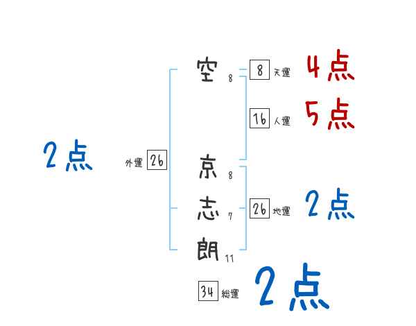 地運![]() | 空京志朗さんの地運は26画の2つ星!波瀾万丈かも。信頼できる人を大事にしましょう。 個性を表す基礎的な運勢です。性格形成や対人関係、行動力など家庭環境に影響されます。主に誕生してから20歳くらいまでの若年期の運勢を表します。 |