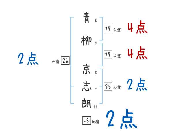 外運![]() | 青栁京志朗さんの外運は26画の2つ星!波瀾万丈かも。信頼できる人を大事にしましょう。 生活面を象徴する運勢です。外部から受ける影響力を表し、結婚運、家庭運や職場、環境への順応性を表します。 |
