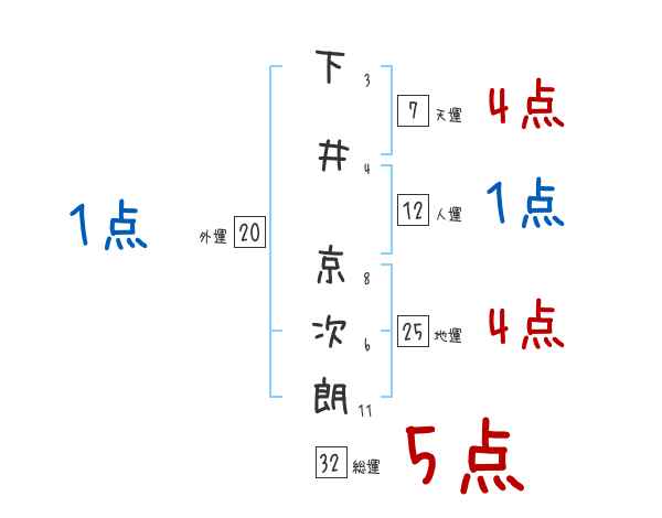 総運![]() | 下井京次朗さんの総運は32画の5つ星!柔軟性があり成功する。チャンスが多く金運が良い。 あなたの人生を表す1番重要な運勢です。生涯を通じて影響する総合運となり、主に50歳以降の晩年期に影響を及ぼします。 |