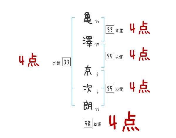 外運![]() | 亀澤京次朗さんの外運は33画の4つ星!権力志向でプライドが高い。勇気があり運を切り開き成功する。 生活面を象徴する運勢です。外部から受ける影響力を表し、結婚運、家庭運や職場、環境への順応性を表します。 |
