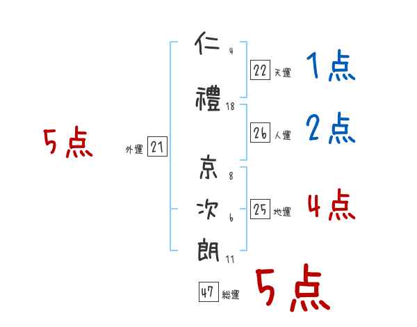 総運![]() | 仁禮京次朗さんの総運は47画の5つ星!実力が開花し発展する円満な人生。財に恵まれる。 あなたの人生を表す1番重要な運勢です。生涯を通じて影響する総合運となり、主に50歳以降の晩年期に影響を及ぼします。 |