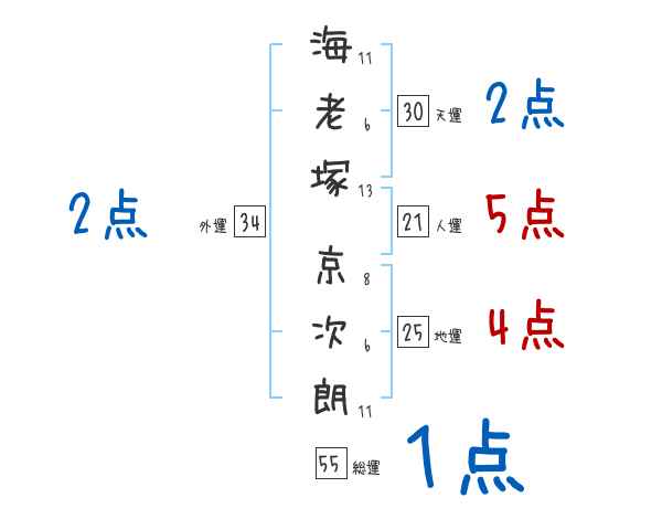 天運![]() | 海老塚京次朗さんの天運は30画の2つ星!浮き沈みの激しさに注意しましょう。 家系が持つ宿命的な運勢を表します。祖先から受け継いだ苗字ですので自分の力が及びません。家柄を象徴します。 |