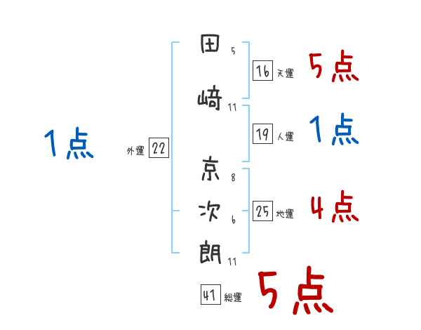 天運![]() | 田﨑京次朗さんの天運は16画の5つ星!人望が厚く大きく発展する。逆転成功が見える。 家系が持つ宿命的な運勢を表します。祖先から受け継いだ苗字ですので自分の力が及びません。家柄を象徴します。 |