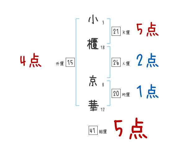 天運![]() | 小櫃京華さんの天運は21画の5つ星!統率力がある。独立し成功する。名誉を手に入れる。 家系が持つ宿命的な運勢を表します。祖先から受け継いだ苗字ですので自分の力が及びません。家柄を象徴します。 |