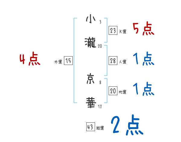 天運![]() | 小瀧京華さんの天運は23画の5つ星!想像力に優れ活力がある。一代で成功し名誉を手に入れる。 家系が持つ宿命的な運勢を表します。祖先から受け継いだ苗字ですので自分の力が及びません。家柄を象徴します。 |