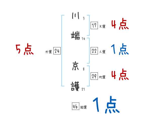 人運![]() | 川端京護さんの人運は22画の1つ星!努力することが苦手ないっぽう手先が器用。芸術性にも優れる。 性格や才能などを表す2番目に重要な運勢です。人間関係や協調性、社会的な成功に影響します。主に20歳から50歳ぐらいまでの中年期の運勢を表します。 |