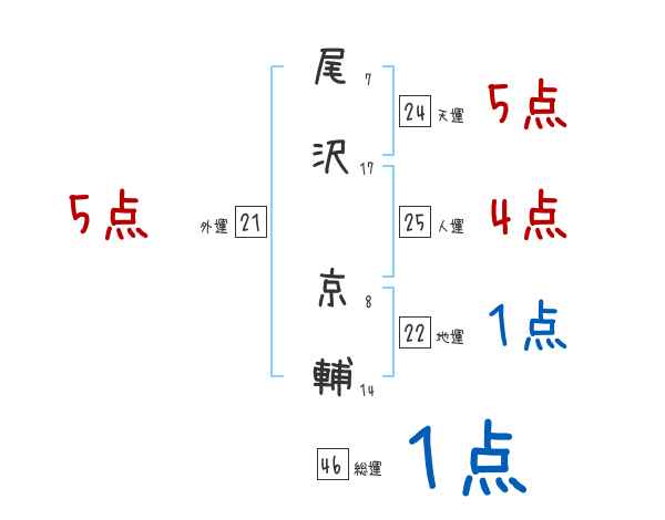天運![]() | 尾沢京輔さんの天運は24画の5つ星!家庭運が良く順調な人生。金運にも恵まれる。 家系が持つ宿命的な運勢を表します。祖先から受け継いだ苗字ですので自分の力が及びません。家柄を象徴します。 |