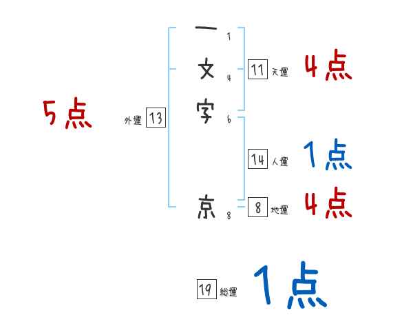 外運![]() | 一文字京さんの外運は13画の5つ星!才能に恵まれ人気がある。名声を手に入れる。円満な人生。 生活面を象徴する運勢です。外部から受ける影響力を表し、結婚運、家庭運や職場、環境への順応性を表します。 |