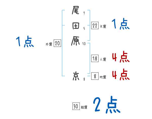 天運![]() | 尾田原京さんの天運は22画の1つ星!努力することが苦手ないっぽう手先が器用。芸術性にも優れる。 家系が持つ宿命的な運勢を表します。祖先から受け継いだ苗字ですので自分の力が及びません。家柄を象徴します。 |