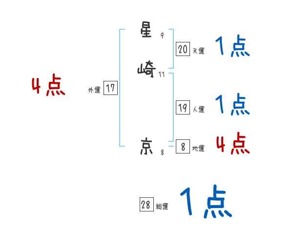 総運![]() | 星崎京さんの総運は28画の1つ星!家庭環境に注意。スポーツで活躍できる能力があるかも。 あなたの人生を表す1番重要な運勢です。生涯を通じて影響する総合運となり、主に50歳以降の晩年期に影響を及ぼします。 |