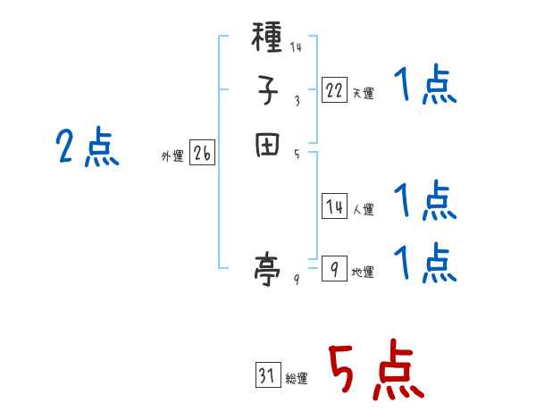 天運![]() | 種子田亭さんの天運は22画の1つ星!努力することが苦手ないっぽう手先が器用。芸術性にも優れる。 家系が持つ宿命的な運勢を表します。祖先から受け継いだ苗字ですので自分の力が及びません。家柄を象徴します。 |