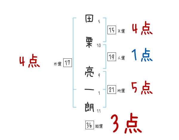 外運![]() | 田栗亮一朗さんの外運は17画の4つ星!積極的な行動力。地位を気づき財産を手に入れる。純粋な心と直感力。 生活面を象徴する運勢です。外部から受ける影響力を表し、結婚運、家庭運や職場、環境への順応性を表します。 |