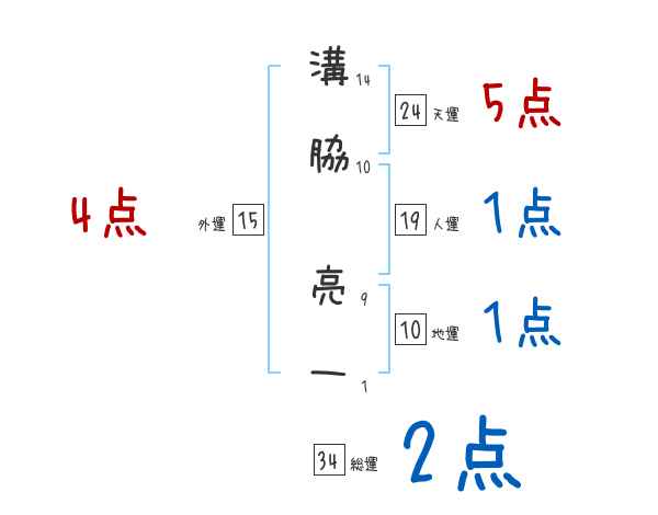 天運![]() | 溝脇亮一さんの天運は24画の5つ星!家庭運が良く順調な人生。金運にも恵まれる。 家系が持つ宿命的な運勢を表します。祖先から受け継いだ苗字ですので自分の力が及びません。家柄を象徴します。 |