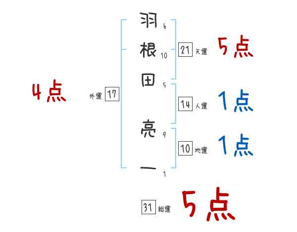 外運![]() | 羽根田亮一さんの外運は17画の4つ星!積極的な行動力。地位を気づき財産を手に入れる。純粋な心と直感力。 生活面を象徴する運勢です。外部から受ける影響力を表し、結婚運、家庭運や職場、環境への順応性を表します。 |