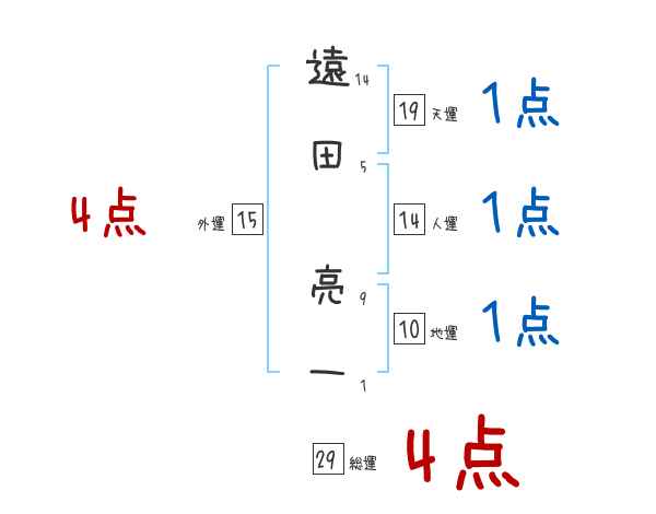 総運![]() | 遠田亮一さんの総運は29画の4つ星!完全主義で才能がある。厳格な心の持ち主。 あなたの人生を表す1番重要な運勢です。生涯を通じて影響する総合運となり、主に50歳以降の晩年期に影響を及ぼします。 |