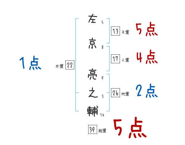天運![]() | 左京亮之輔さんの天運は13画の5つ星!才能に恵まれ人気がある。名声を手に入れる。円満な人生。 家系が持つ宿命的な運勢を表します。祖先から受け継いだ苗字ですので自分の力が及びません。家柄を象徴します。 |
